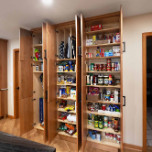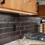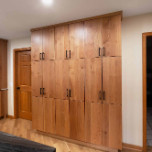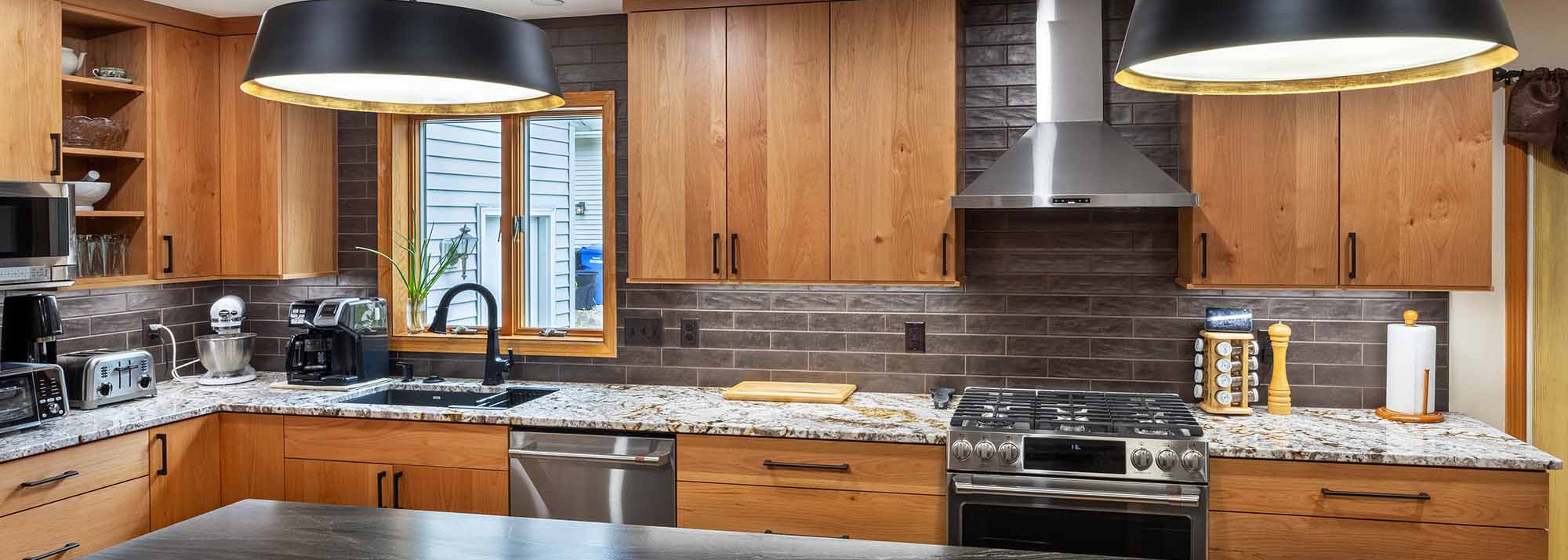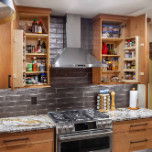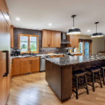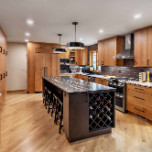 The layout for this kitchen was completely updated with new locations for the stove and refrigerator, a new island (with wine racks), and expanded storage with beautiful cherry cabinets. The homeowner and our designer decided on a dark backsplash and a dark top for the island to provide contrast to the light wood cabinets and surrounding countertops. The old kitchen tile was replaced with white oak floors, and we refinished all the wood flooring on that level of the house for a seamless, cohesive look. New stainless steel appliances and a matching range hood, along with new lighting, complete this distinguished kitchen remodel.